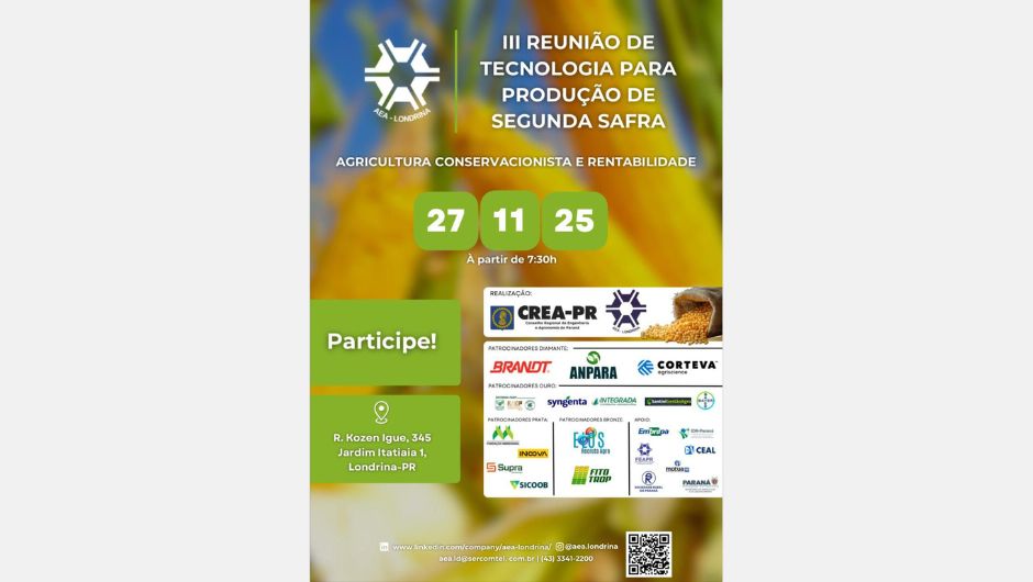 Organizado pela Associação dos Engenheiros Agrônomos de Londrina (AEA-Londrina) e pelo Crea-PR, o evento acontecerá na sede da AEA e irá destacar o uso de práticas conservacionistas, o manejo integrado do solo e os caminhos para ampliar a rentabilidade dos produtores dentro de um modelo de agricultura sustentável.