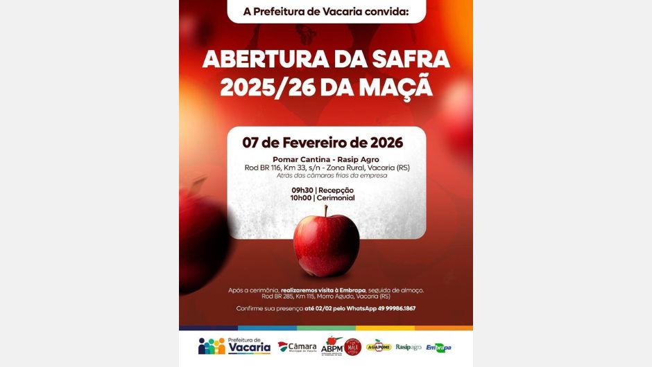 A cerimônia acontece em um pomar da Rasip Agro e reúne produtores, lideranças do agronegócio, autoridades e entidades representativas do setor. A iniciativa é promovida pela Prefeitura de Vacaria, com participação da Associação Brasileira de Produtores de Maçã (ABPM), que representa os principais produtores da fruta no Brasil.