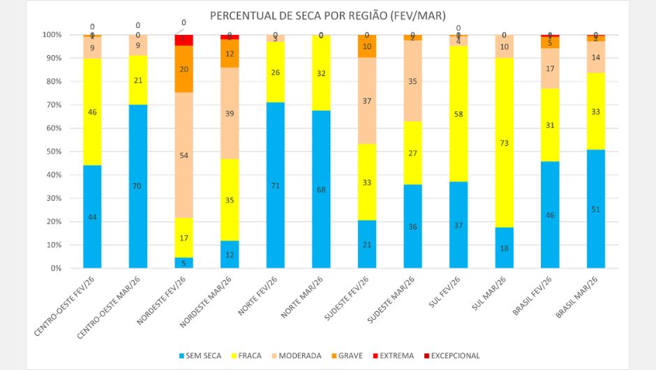 O Centro-Oeste registrou o menor percentual de área afetada (30%) e deixou de apresentar seca grave, condição que ainda atingia municípios de Goiás e Mato Grosso do Sul em fevereiro. No Sudeste, também houve redução da severidade, com o fim da seca grave em Minas Gerais.