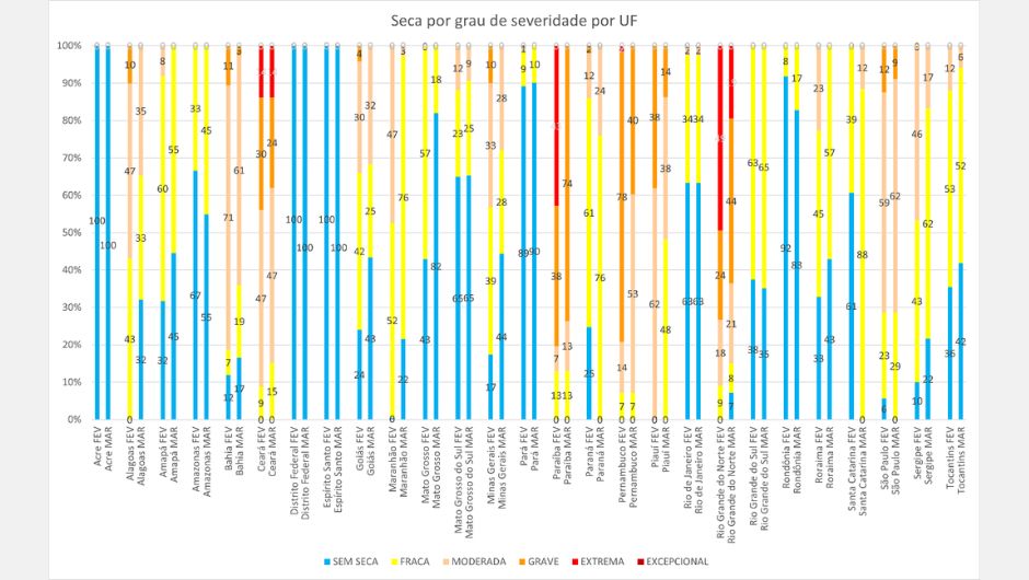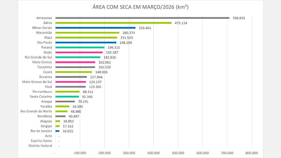 Sete estados apresentaram seca em 100% do território em março: Ceará, Paraíba, Paraná, Pernambuco, Piauí, Santa Catarina e São Paulo. Nos demais, a cobertura variou entre 10% e 93%.