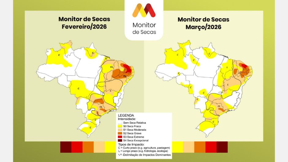 A seca perdeu intensidade em grande parte do Brasil em março de 2026, mas avançou em área nas regiões Sul e Norte, segundo a última atualização do Monitor de Secas. No total, a área afetada pelo fenômeno caiu de 54% para 49% do território nacional, o equivalente a 4,2 milhões de km².
