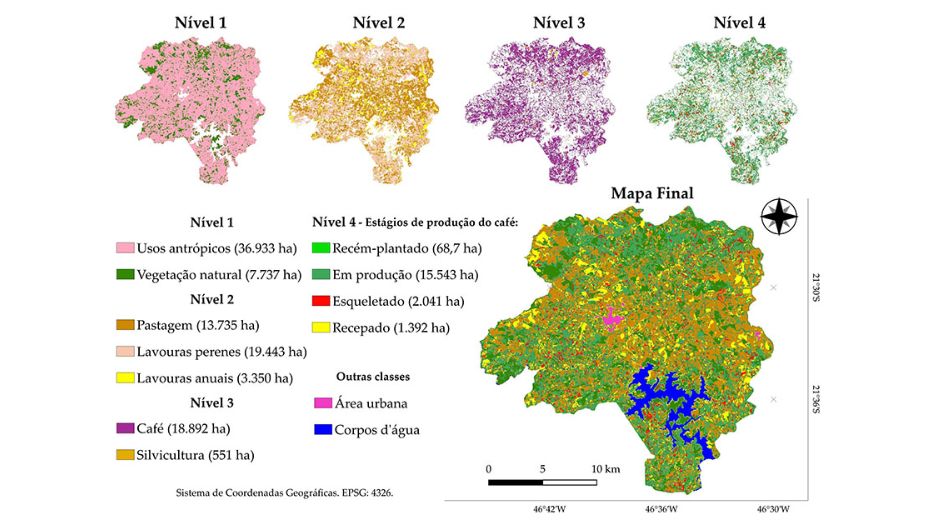 Um sistema hierárquico de classificação foi utilizado, trabalhando-se em quatro níveis. O primeiro separou a vegetação nativa das áreas agrícolas. O segundo nível fez a separação entre culturas perenes, culturas anuais e pastagens. O terceiro nível diferenciou os cafezais de plantios de eucalipto. Já o quarto nível fez a classificação dos cafezais entre áreas de formação (até três anos de plantio), áreas em produção, áreas com poda de esqueletamento e lavouras em renovação por meio da recepa (poda na base da planta).