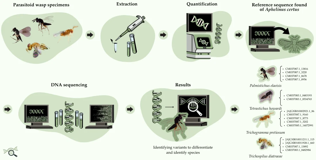 O trabalho utilizou sequenciamento completo do genoma com a plataforma Illumina NovaSeq 6000. A abordagem permitiu detectar variantes específicas em cada espécie. Foram identificadas quatro variantes para Palmistichus elaeisis, duas para Tetrastichus howardi, quatro para Trichospilus diatraeae e cinco para Trichogramma pretiosum. Esses marcadores possibilitam discriminação individual precisa entre espécies morfologicamente semelhantes.