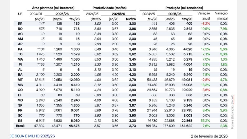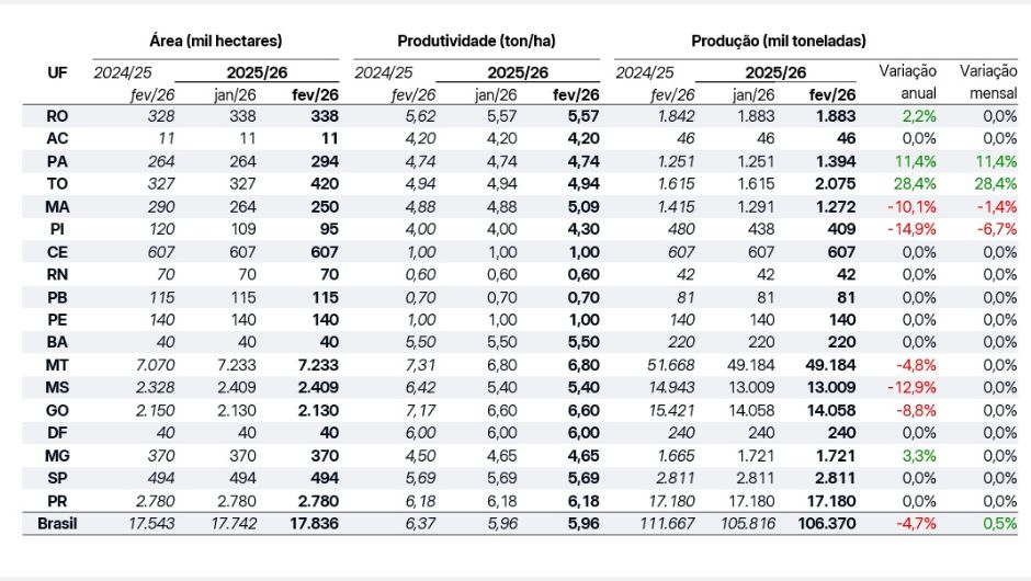 No caso do milho segunda safra, a revisão na produção no reporte de janeiro foi sutil, 0,5%, saindo de 105,8 milhões de toneladas estimadas em janeiro para 106,3 milhões de toneladas neste mês. Houve aumento de área no Tocantins e Pará, enquanto Maranhão e Piauí registraram redução, com produtores atentos ao período de plantio da segunda safra de milho.