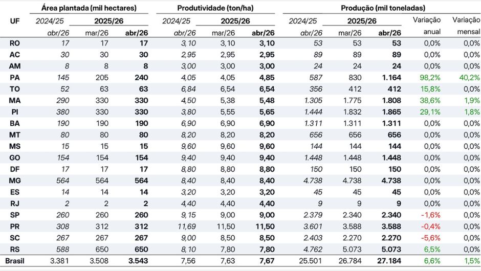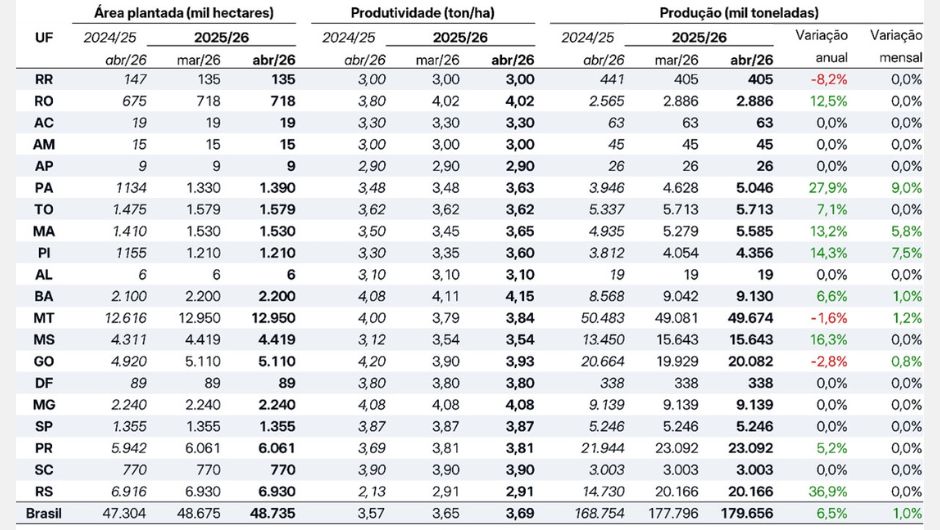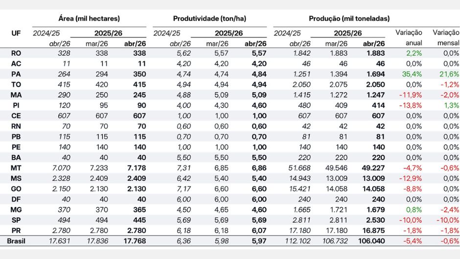 Considerando as três safras de milho, incluindo a terceira safra, estimada em 2,5 milhões de toneladas, a produção total no ciclo 2025/26 foi ajustada de 136 milhões para 135,7 milhões de toneladas.